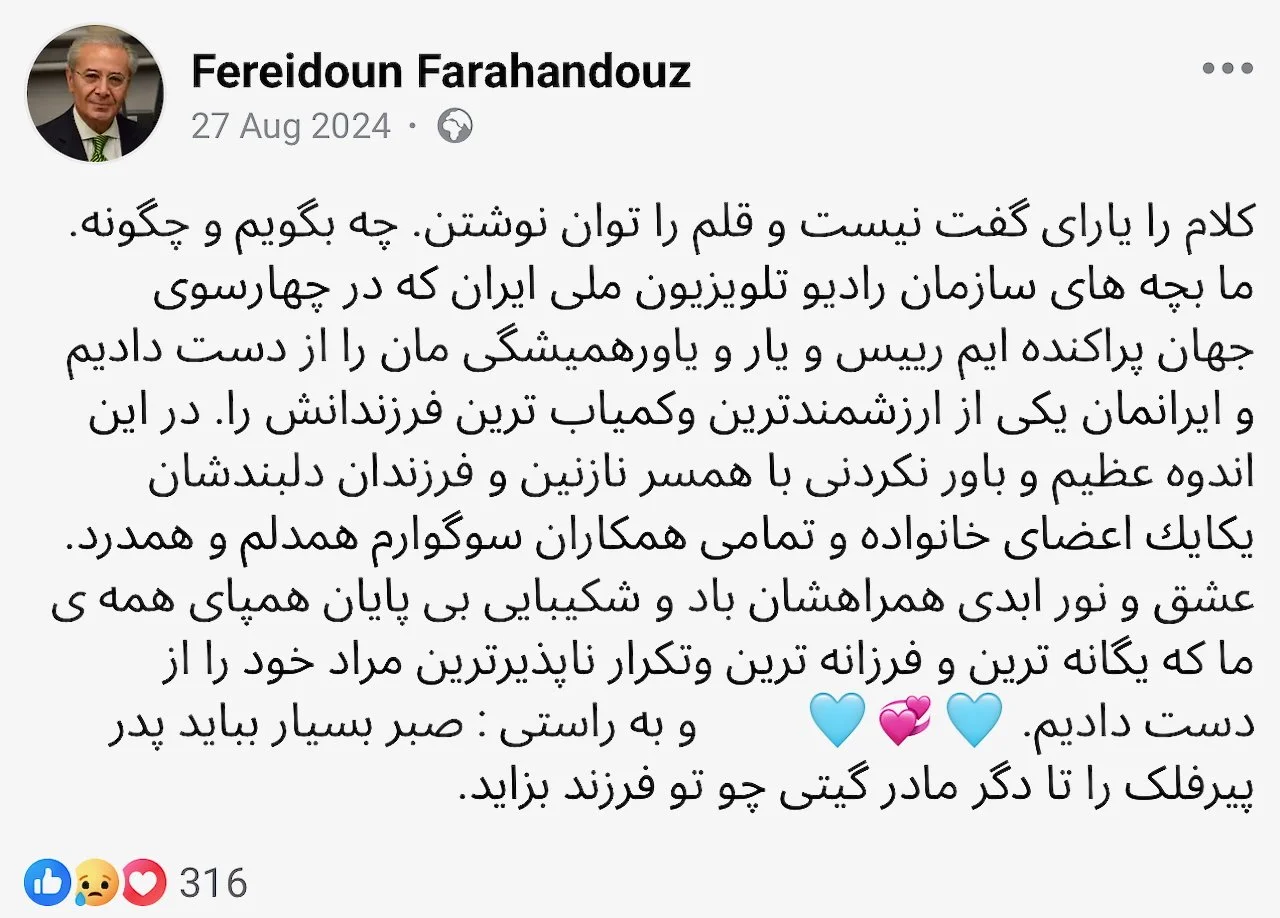 با تسلیت به همسر و فرزندان ایشان، همکاران رادیو تلویزیون و همه مردم ایران