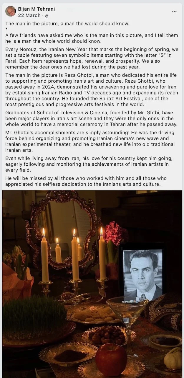 Bob Wilson: Condolence note sent by the late renowned theatre director, Bob Wilson, upon hearing about Reza Ghotbi's passing